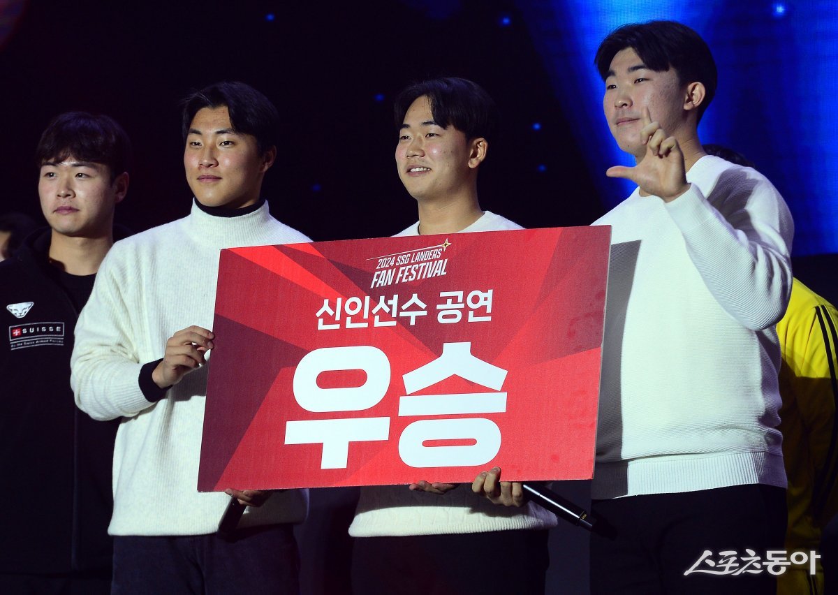 21일 인천 송도 컨벤시아에서 ‘2024 SSG랜더스 팬 페스티벌’이 열렸다. 2024 SSG 신인선수 김규민, 이승민, 박지환이 우승을 차지한 후 기념촬영을 하고 있다.