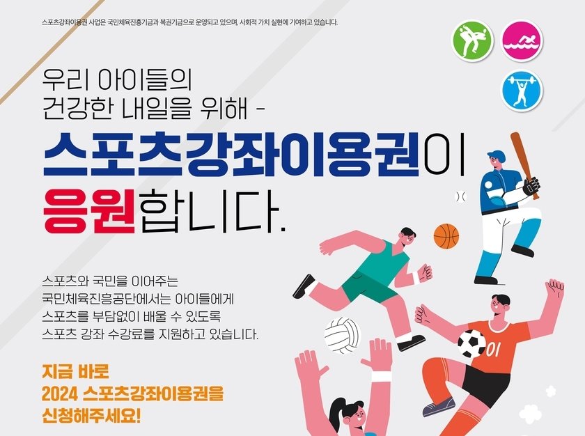 국민체육진흥공단은 22일부터 문화체육관광부 및 전국 지방자치단체와 함께 취약 계층의 스포츠 참여 기회 확대를 위한 2024년 스포츠강좌 이용권 사업의 2차 신청 접수를 시작한다. 2009년 시작된 스포츠강좌 이용권은 저소득층 유·청소년을 대상으로 스포츠 강좌 수강료를 지원하는 사업이다. 지난해에는 총 10,6000명에게 월 9,5000원 범위에서 12개월 동안 지원했으며 올해는 예산을 확대해 저소득층 유·청소년 12만 명에게 매월 10만원 범위 안에서 지원할 예정이다. 지원 대상은 기초생활수급 가구, 차상위계층, 법정 한 부모 가족 유·청소년(2006년∼2019년 출생)이다. 신청 기간은 22일부터 2월 1일까지며 대상자는 스포츠강좌이용권 인터넷 홈페이지(svoucher.kspo.or.kr)와 주민등록상 관할 시·군·구청 및 주민센터에서 신청할 수 있다.