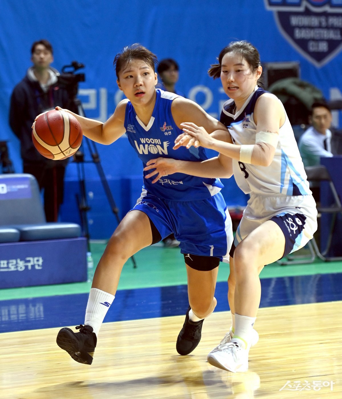 21일 아산이순신체육관에서 열린 ‘우리은행 우리WON 2023~24 여자프로농구’ 우리은행과 신한은행 경기에서 우리은행 박지현이 신한은행의 수비를 뚫고 골밑을 공격하고 있다.