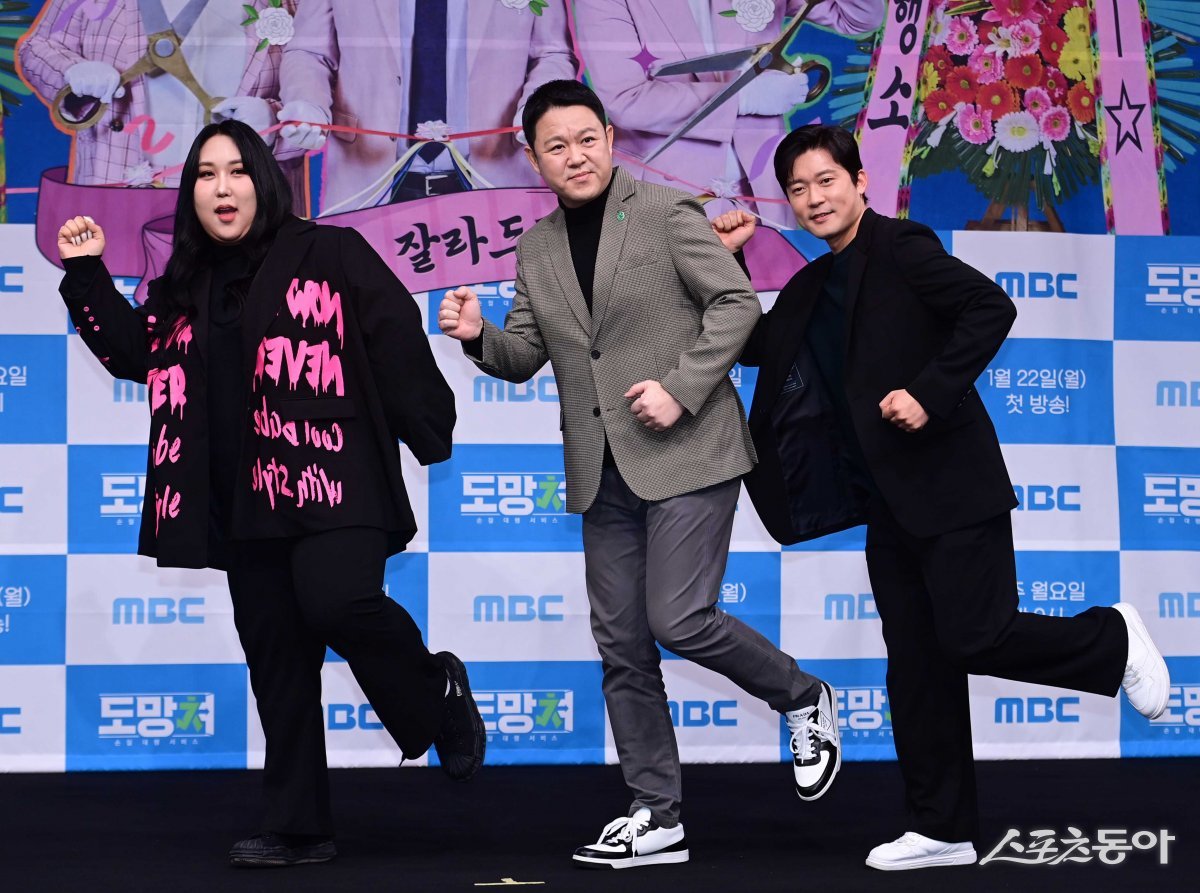 방송인 풍자, 개그맨 김구라, 아나운서 김대호가 22일 서울 마포구 상암동 MBC본사 골든마우스홀에서 열린 MBC ‘도망쳐: 손절 대행 서비스’ 제작발표회에서 포즈를 취하고 있다.