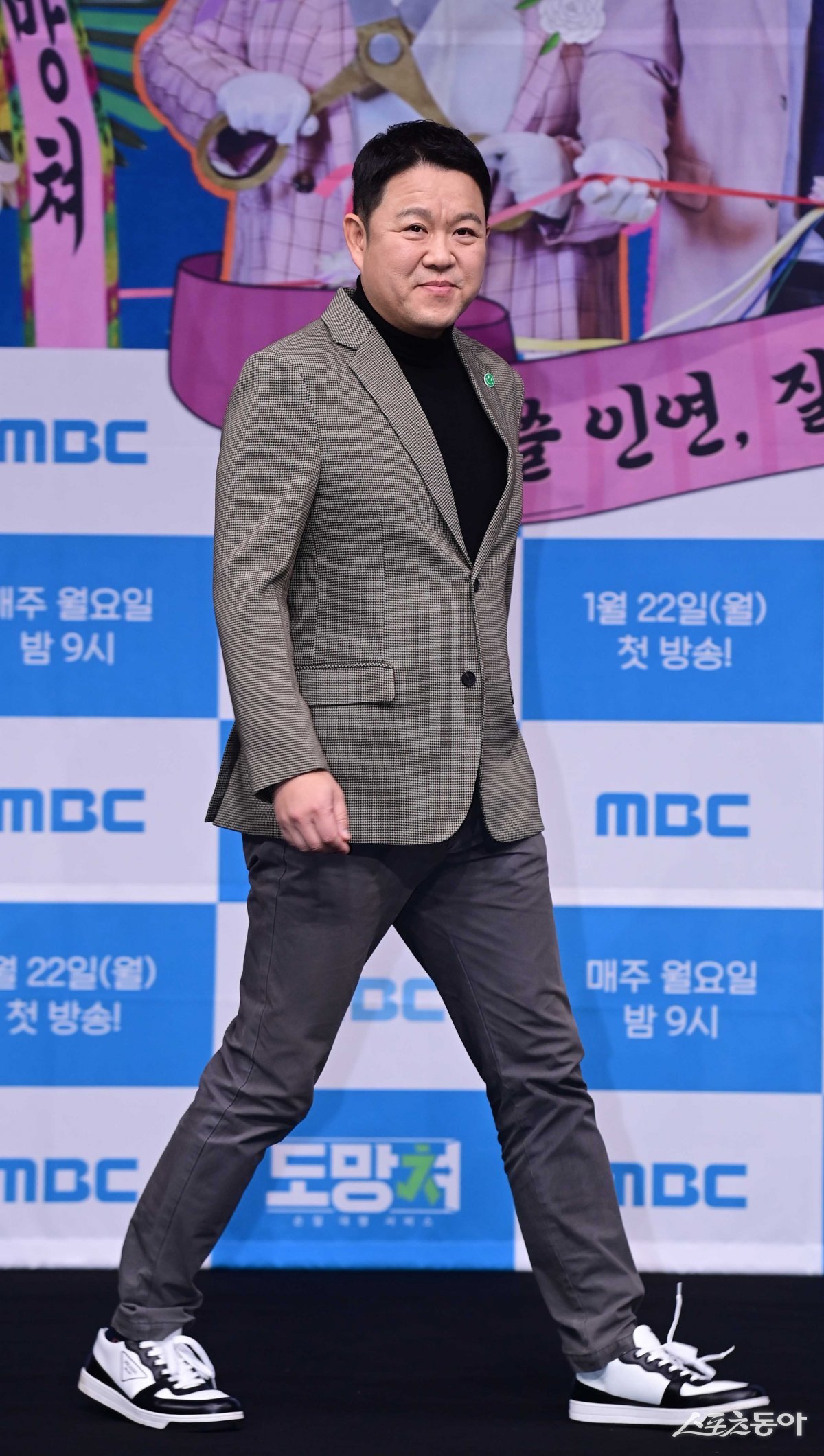 개그맨 김구라가 22일 서울 마포구 상암동 MBC본사 골든마우스홀에서 열린 MBC ‘도망쳐: 손절 대행 서비스’ 제작발표회 무대에 오르고 있다.