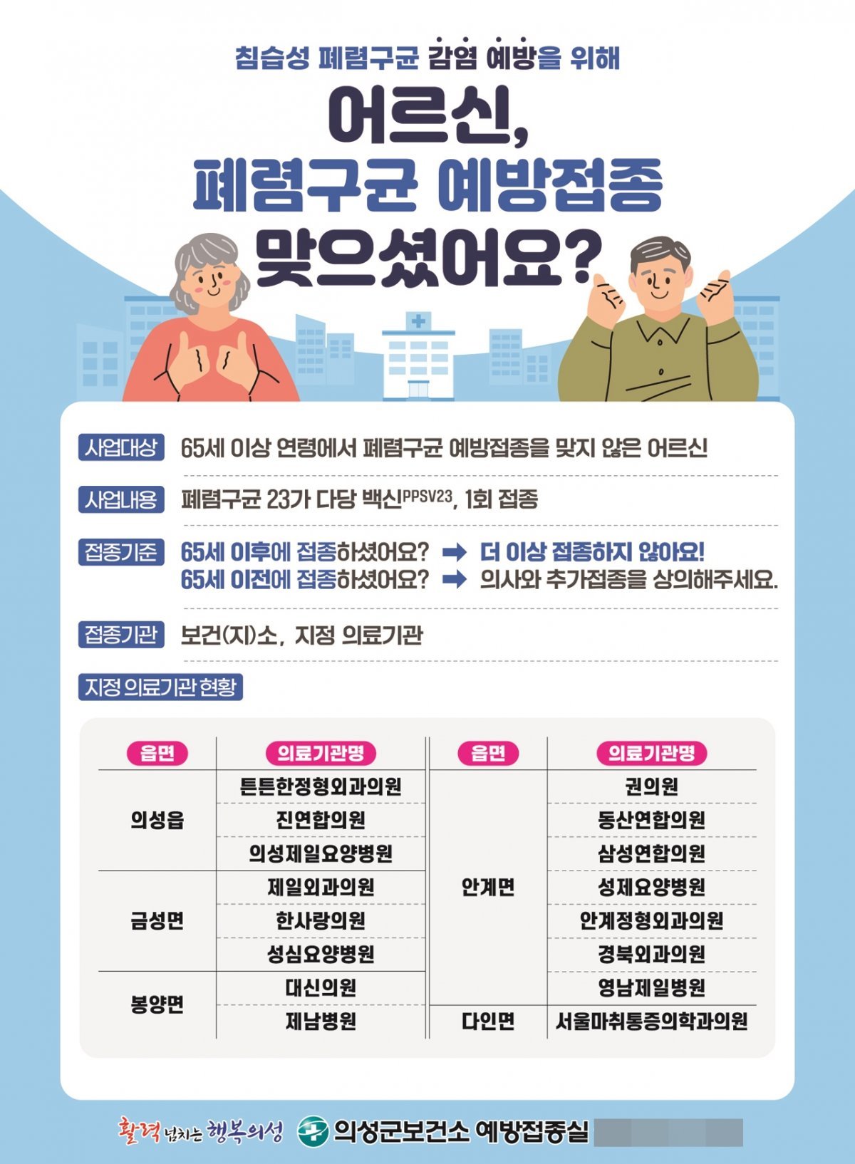 의성군 3월까지 65세 이상 대상 폐렴구균 예방접종 무료 접종 실시