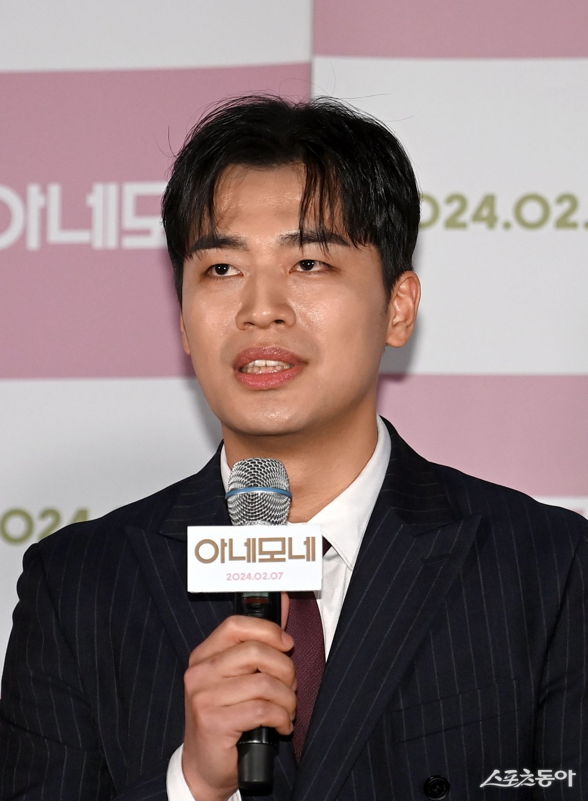 배우 박성진이 25일 서울 용산구 CGV용산아이파크몰점에서 열린 영화 ‘아네모네’ 시사회에서 취재진의 질문에 대답하고 있다.
