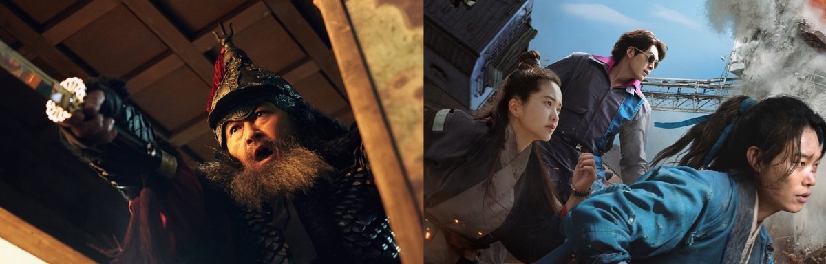 ‘서울의 봄’의 1000만 기운이 ‘노량: 죽음의 바다’와 ‘외계+인 2부’에는 가닿지 못했다. 지난해 12월 20일과 이달 10일 각각 개봉한 두 영화는 24일까지 각각 누적관객 452만 명과 116만 명을 모으는 데 그쳤다. ‘노량’(제작 빅스톤픽쳐스)은 각각 1700만과 720만 관객을 모은 전편인 ‘명량’과 ‘한산: 용의 출현’에 한참 미치지 못했고, ‘외계+인 2부’(제작 케이퍼필름)는 부진했던 1부의 그늘에서 벗어나지 못했다. 하지만 일각에서는 두 영화를 단순히 흥행 성적으로만 평가해서는 안 된다는 목소리가 나온다. 특히 영화계 관계자들은 10년을 이어온 이순신 3부작의 마침표를 찍은 ‘노량’과 SF장르의 불모지 속에서 탄생한 ‘외계+인’ 2부작에 대해 박수를 보내고 있다. ‘외계+인’ 미래와 사극의 만남…한국영화계 SF 장르 가능성 열어