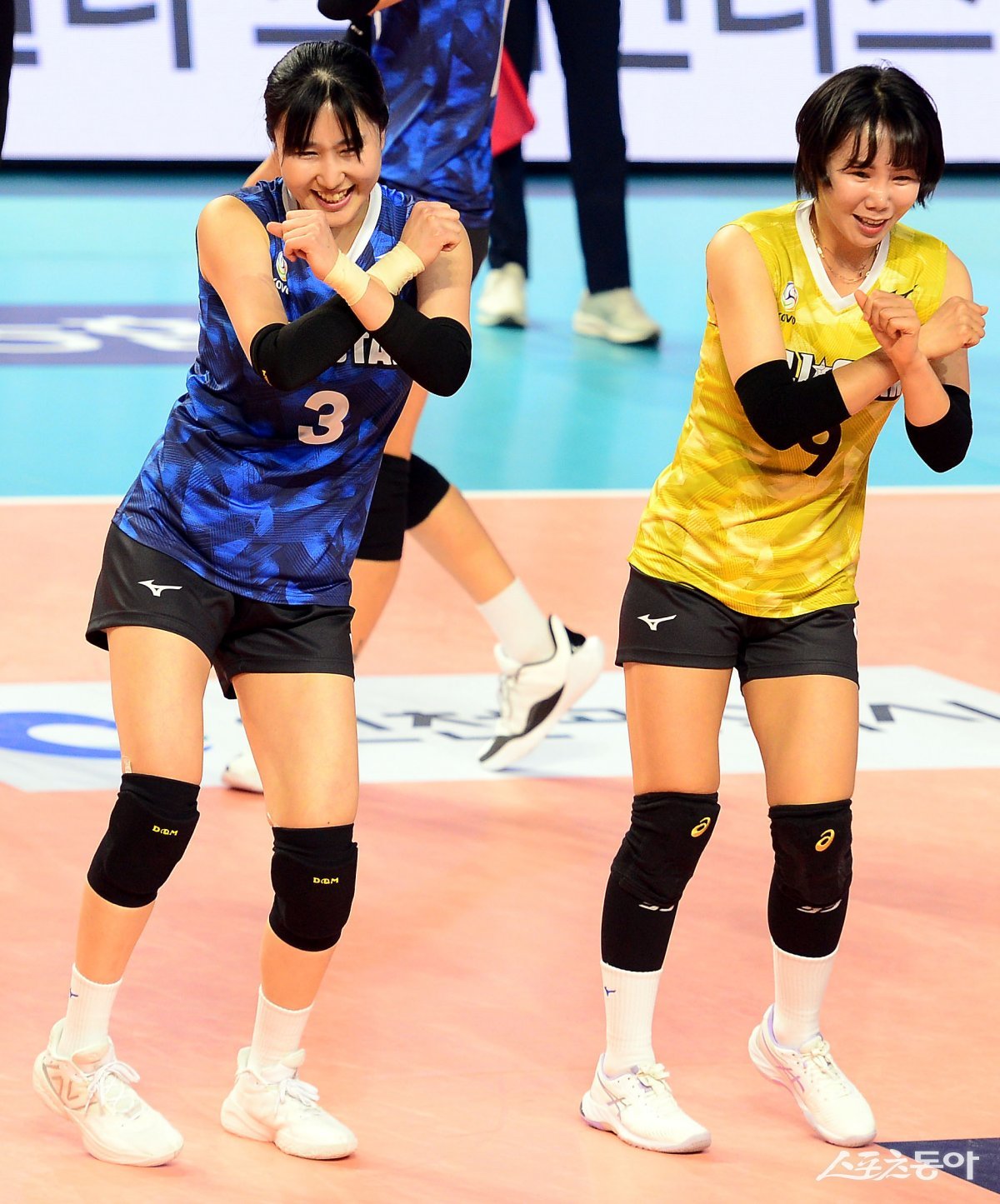 27일 인천 삼산월드체육관에서 ‘2023-2024 도드람 V리그 올스타전’ 경기가 열렸다. V-스타 염혜선과 오지영이 댄스를 펼치고 있다.