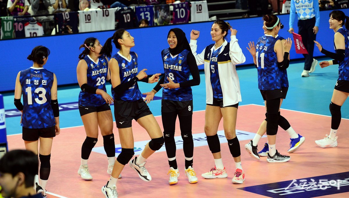 27일 인천 삼산월드체육관에서 ‘2023-2024 도드람 V리그 올스타전’ 경기가 열렸다. V-스타 선수들이 댄스를 펼치고 있다.