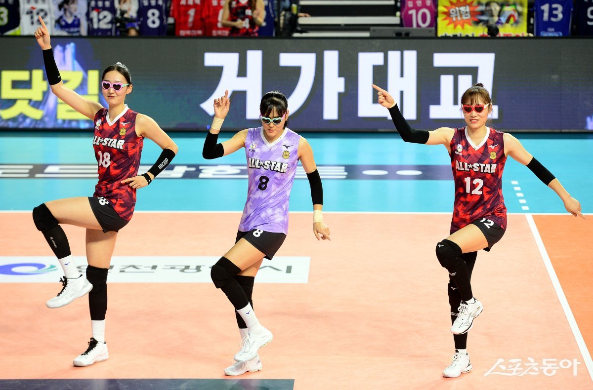 27일 인천 삼산월드체육관에서 ‘2023-2024 도드람 V리그 올스타전’ 경기가 열렸다. K-스타 김세빈, 임명옥, 문정원이 댄스를 펼치고 있다.