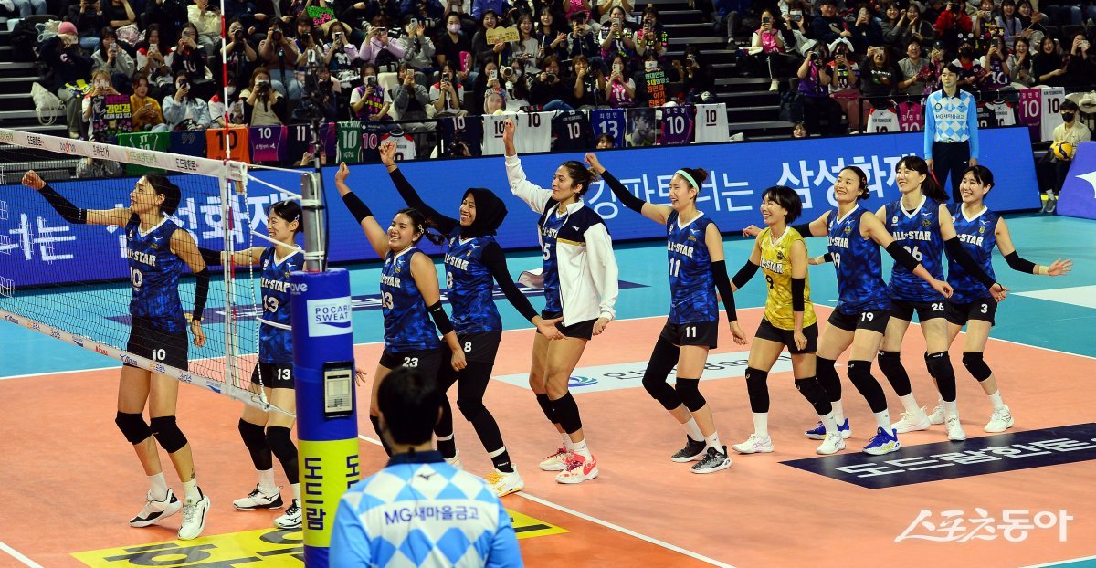 27일 인천 삼산월드체육관에서 ‘2023-2024 도드람 V리그 올스타전’ 경기가 열렸다. V-스타 선수들이 댄스를 펼치고 있다.