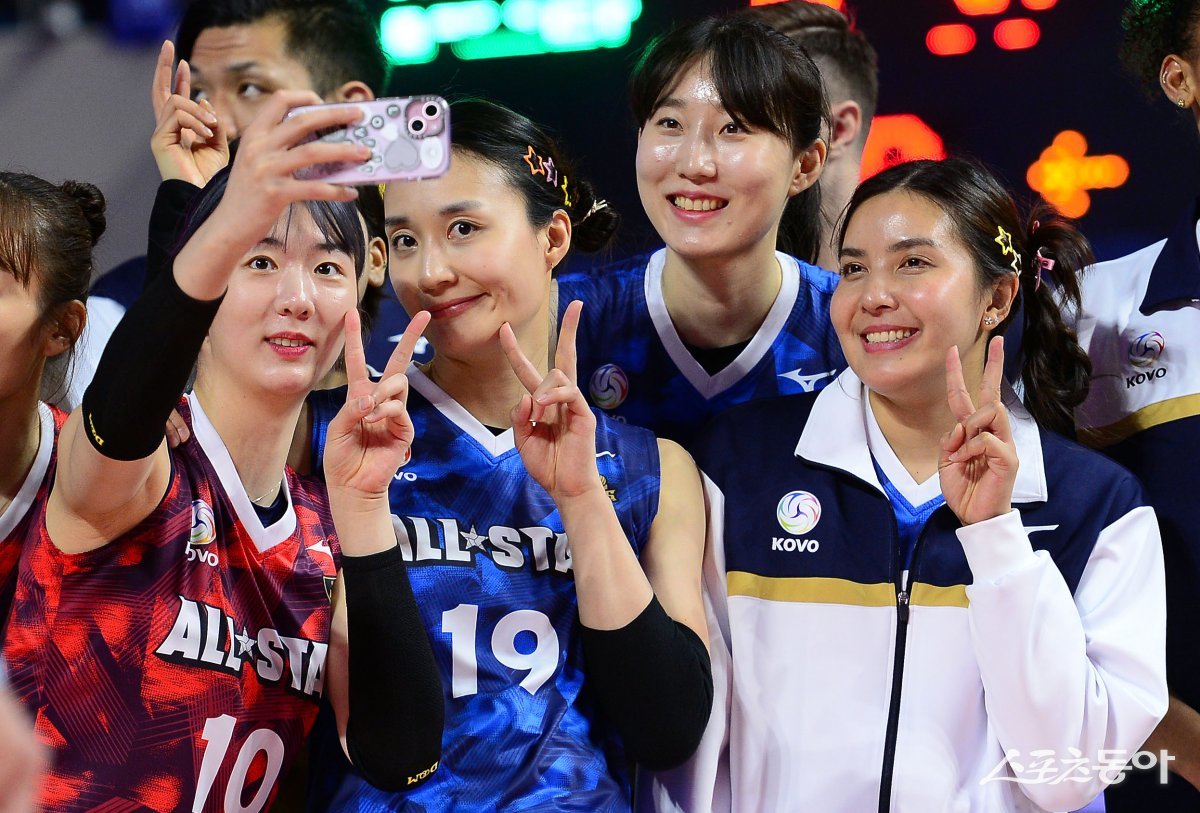 27일 인천 삼산월드체육관에서 ‘2023-2024 도드람 V리그 올스타전’ 경기가 열렸다. 올스타 종료 후 강소휘, 표승주, 박정아, 폰푼이 기념촬영을 하고 있다.