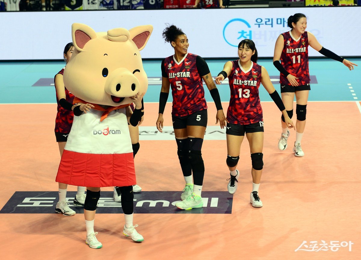 27일 인천 삼산월드체육관에서 ‘2023-2024 도드람 V리그 올스타전’ 경기가 열렸다. K-스타 김지원이 돼지인형을 쓴채 경기에 나서고 있다.