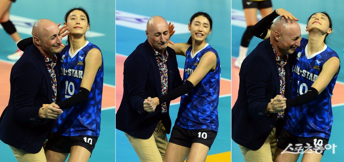 27일 인천 삼산월드체육관에서 ‘2023-2024 도드람 V리그 올스타전’ 경기가 열렸다. V-스타 김연경이 아본단자 감독과 댄스를 펼치고 있다.