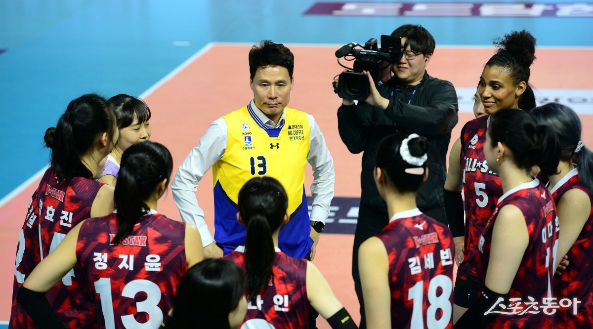 27일 인천 삼산월드체육관에서 ‘2023-2024 도드람 V리그 올스타전’ 경기가 열렸다. K-스타 강성형 감독이 선수로 나서 작전을 듣고 있다.