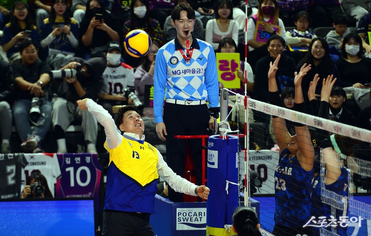 27일 인천 삼산월드체육관에서 ‘2023-2024 도드람 V리그 올스타전’ 경기가 열렸다. K-스타 강성형 감독이 선수로 나서 공격을 펼치고 있다.