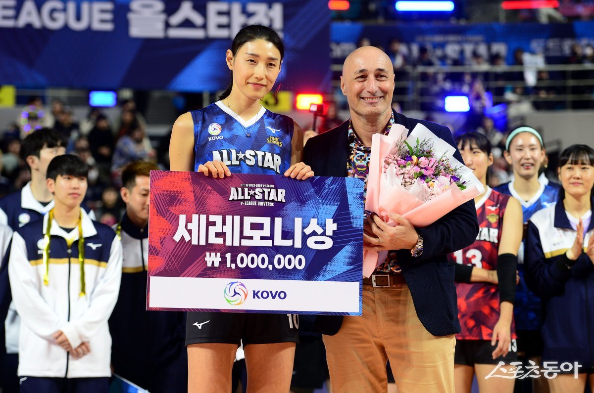 27일 인천 삼산월드체육관에서 ‘2023-2024 도드람 V리그 올스타전’ 경기가 열렸다. 올스타전 세리머니상을 수상한 김연경이 아본단자 감독과 기념촬영을 하고 있다.