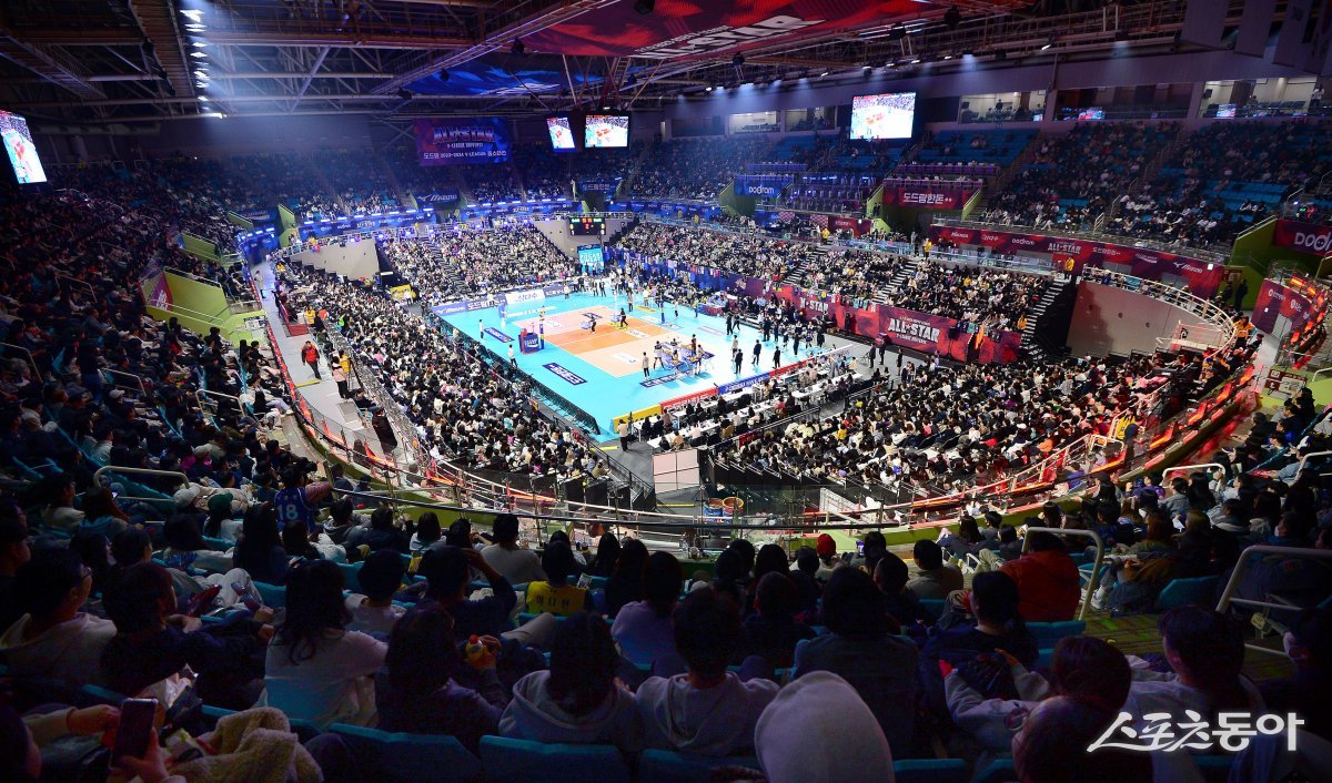27일 인천 삼산월드체육관에서 ‘2023-2024 도드람 V리그 올스타전’ 경기가 열렸다. 6,120명의 배구팬이 관중석을 가득메워 응원을 펼치고 있다.