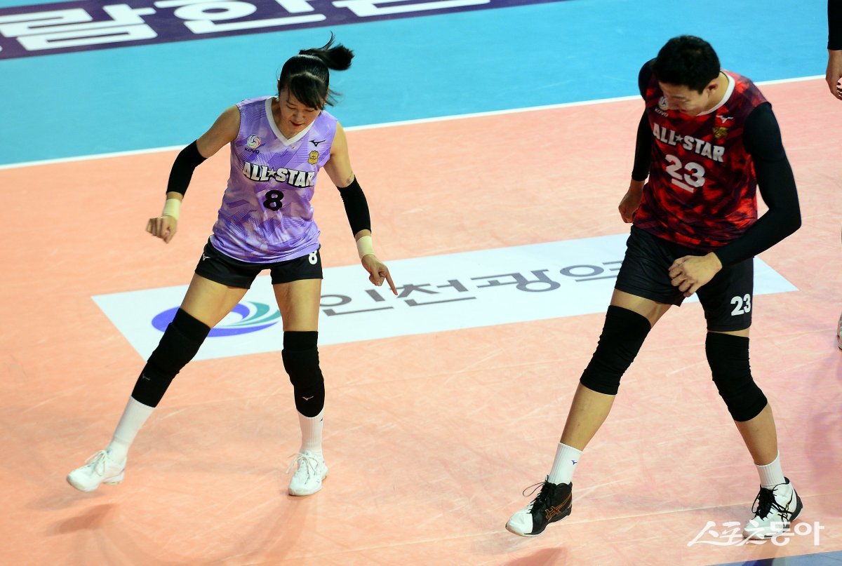 27일 인천 삼산월드체육관에서 ‘2023-2024 도드람 V리그 올스타전’ 경기가 열렸다. K-스타 임명옥과 신영석이 슬릭백을 펼치고 있다.