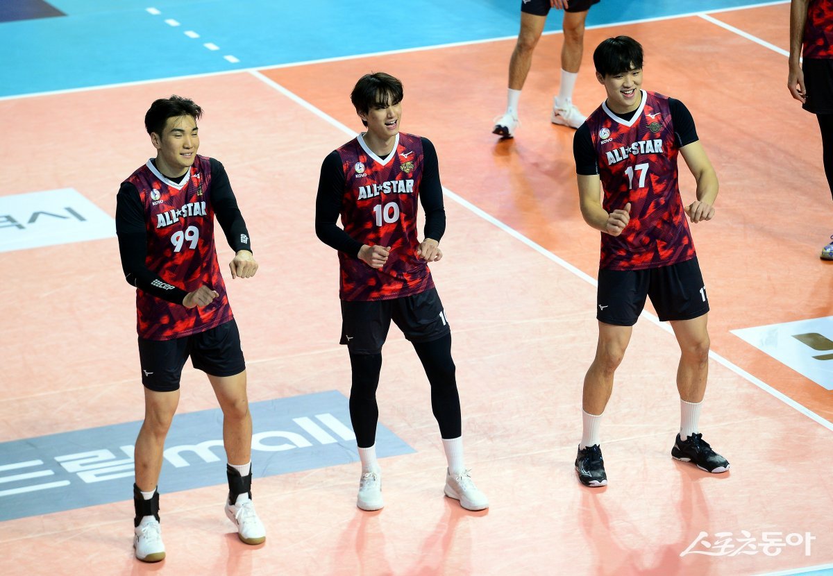 27일 인천 삼산월드체육관에서 ‘2023-2024 도드람 V리그 올스타전’ 경기가 열렸다. K-스타 바야르사이한, 임성진, 임동혁이 댄스를 펼치고 있다.