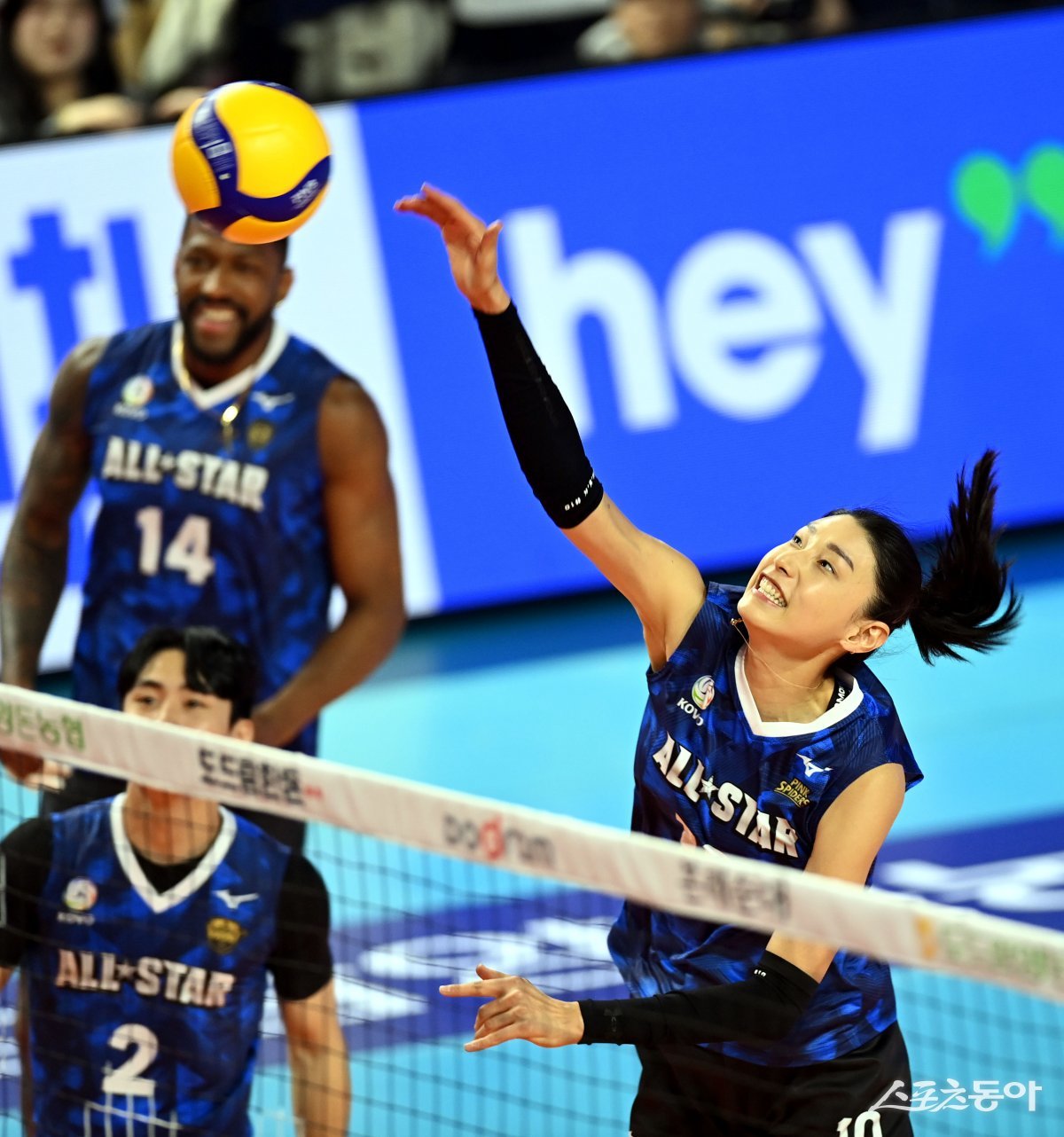 27일 인천 삼산월드체육관에서 ‘2023-2024 도드람 V리그 올스타전’ 경기가 열렸다. V-스타 김연경이 남자부 경기에 참가해 공격을 펼치고 있다.