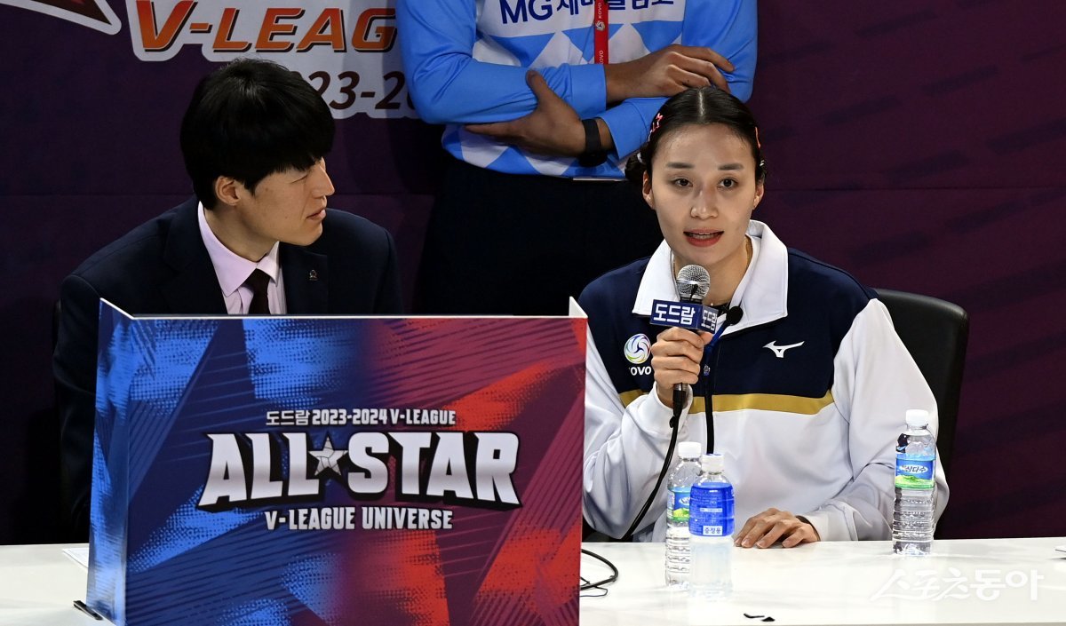 27일 인천 삼산월드체육관에서 ‘2023-2024 도드람 V리그 올스타전’ 경기가 열렸다. V-스타 표승주가 비디오 판독을 하고 있다.