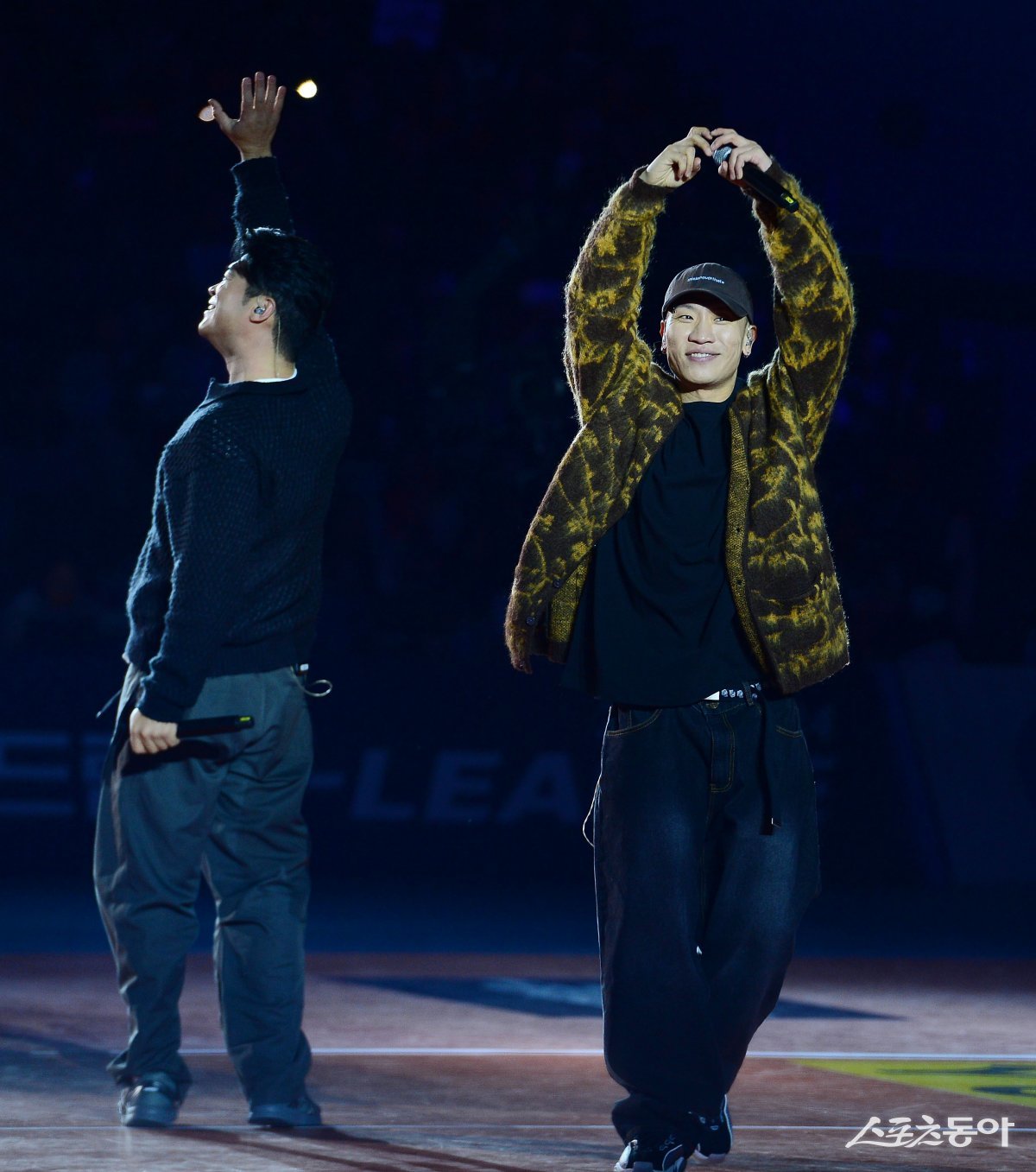 27일 인천 삼산월드체육관에서 ‘2023-2024 도드람 V리그 올스타전’ 경기가 열렸다. 다이나믹 듀오가 화려한 공연을 펼치고 있다.