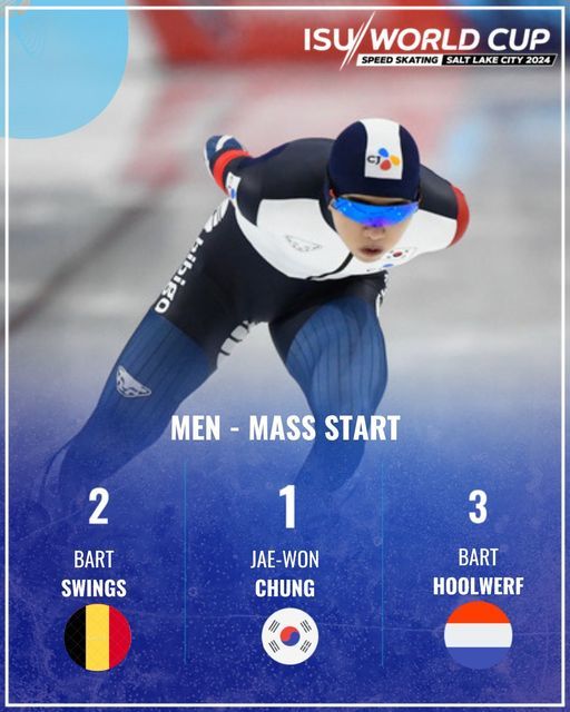 정재원은 27일(한국시간) 미국 솔트레이크시티 유타올림픽오벌에서 열린 국제빙상경기연맹(ISU) 2023~2024시즌 스피드스케이팅 월드컵 5차 대회 남자 매스스타트 디비전A 결선에서 7분42초35로 가장 먼저 결승선을 통과했다. 레이스 중반까지 호시탐탐 기회를 엿보다가 폭발적 스퍼트로 선두에 오른 뒤 바트 스윙스(벨기에)의 막판 추격까지 뿌리치며 웃었다.