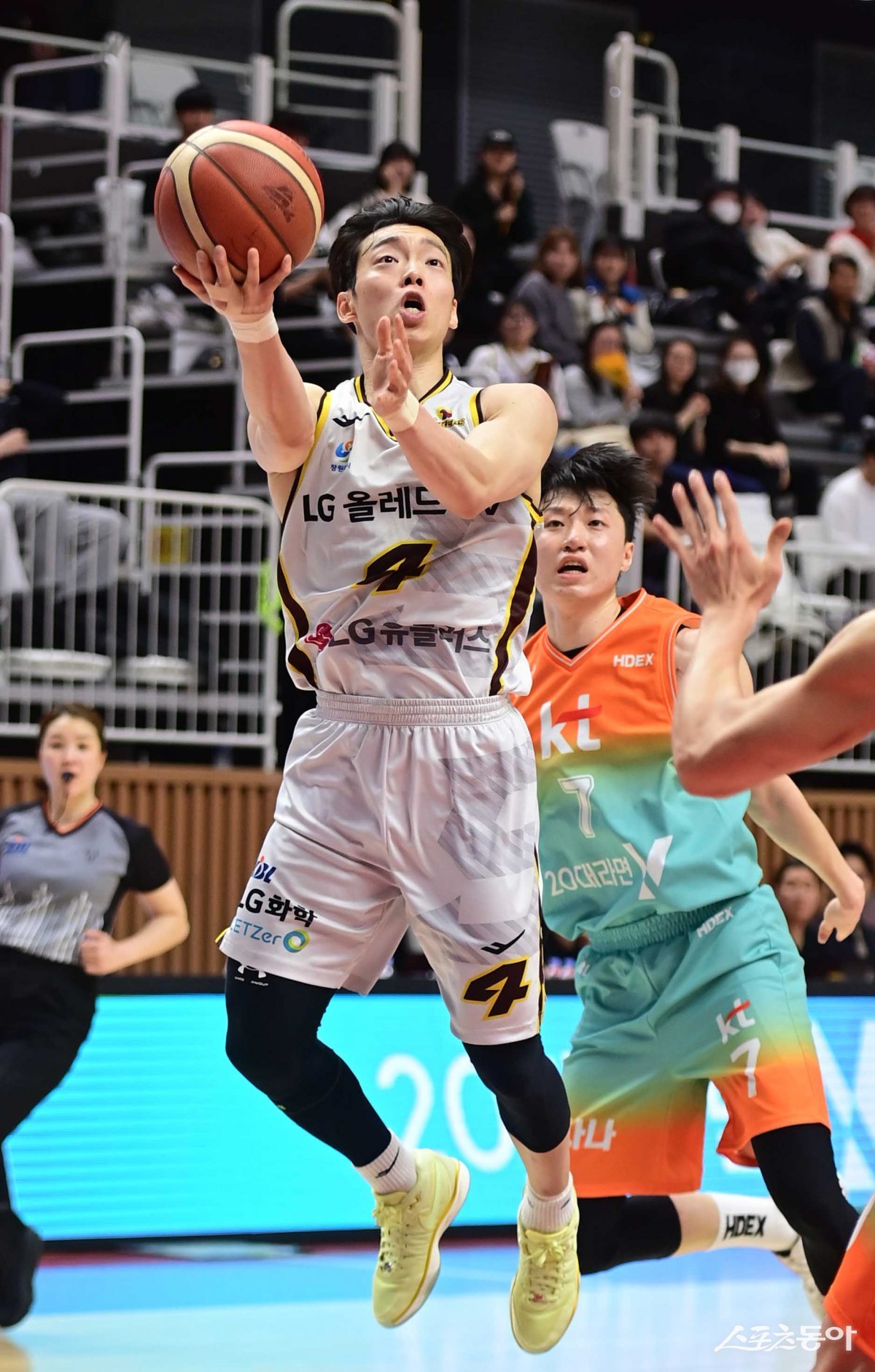 28일 수원KT소닉붐아레나에서 열린 ‘2023-2024 정관장 프로농구’ 수원 KT와 창원 LG의 경기에서 LT 이재도가 KT 수비를 뚫고 슛을 하고 있다. 수원 | 주현희 기자 teth1147@donga.com