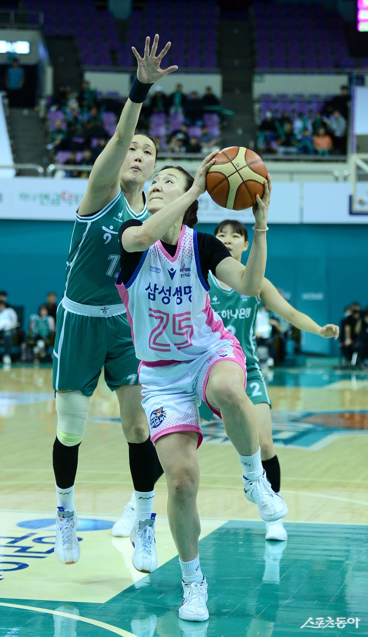 28일 부천체육관에서 열린 ‘우리은행 우리WON 2023~24 여자프로농구’ 하나원큐와 삼성생명 경기에서 삼성생명 배혜윤이 하나원큐 김정은의 수비를 뚫고 골밑을 공격하고 있다.