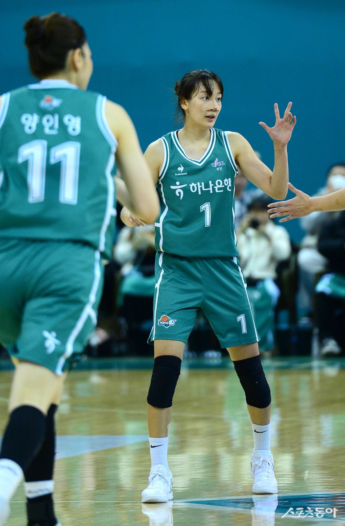 28일 부천체육관에서 열린 ‘우리은행 우리WON 2023~24 여자프로농구’ 하나원큐와 삼성생명 경기에서 하나원큐 신지현이 3쿼터 역전 3점슛을 성공시킨 후 기뻐하고 있다.