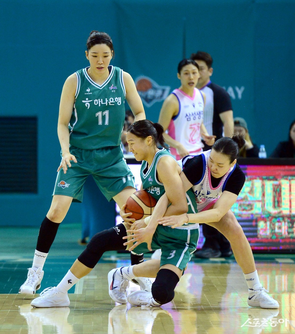 28일 부천체육관에서 열린 ‘우리은행 우리WON 2023~24 여자프로농구’ 하나원큐와 삼성생명 경기에서 하나원큐 정예림이 스틸에 성공하고 있다.
