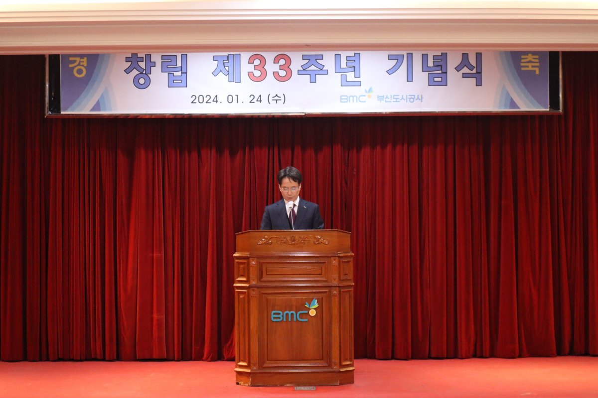 부산도시공사가 지난 24일 본사에서 창립 33주년 기념식을 개최한 가운데 김용학 사장이 창립기념사를 발표하고 있다. 사진제공ㅣ부산도시공사