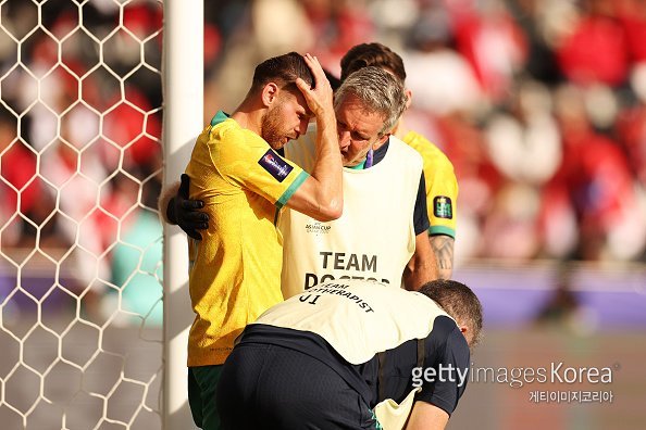 28일 카타르 알라이얀의 자심 빈 하마드 스타디움에서 열린 2023 아시아축구연맹(AFC) 카타르 아시안컵 16강전 호주와인도네시아의 경기에서 전반 45분 골을 넣은 마틴 보일(호주)이 머리를 만지며 불편함을 호소하고 있다.