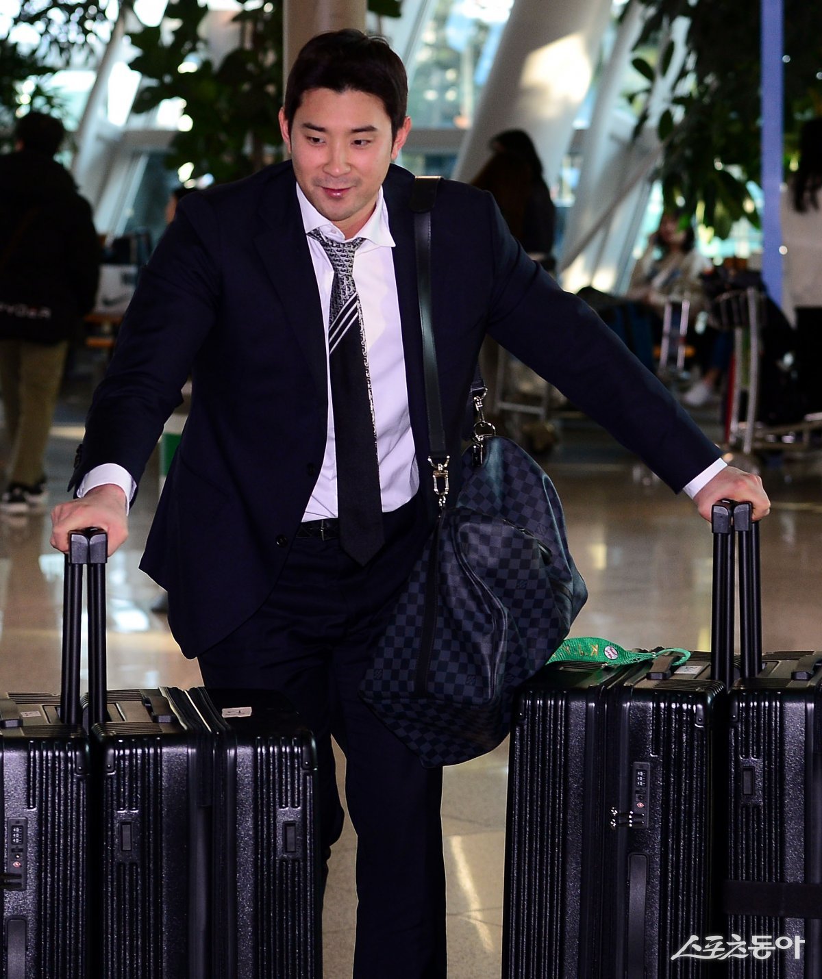 프로야구 두산 베어스가 29일 인천국제공항을 통해 스프링캠프 훈련지인 호주로 출국했다. 두산 강승호가 출국장으로 이동하고 있다.