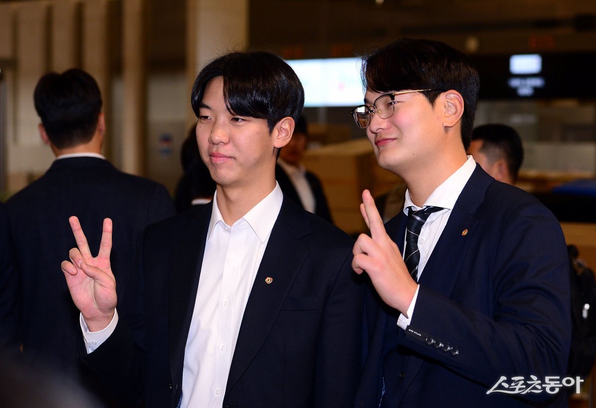 프로야구 한화 이글스가 30일 인천국제공항을 통해 스프링캠프 훈련지인 호주로 출국했다. 한화 황준서와 김서현이 포즈를 취하고 있다.