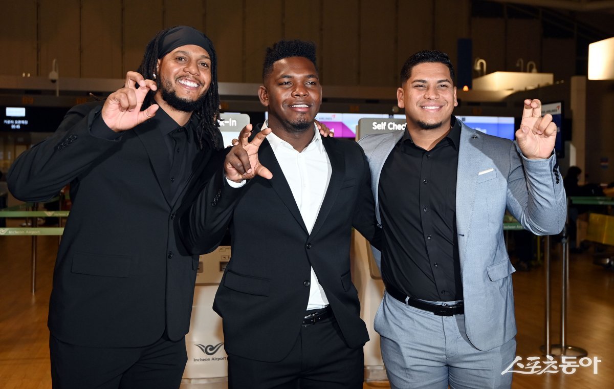 프로야구 한화 이글스가 30일 인천국제공항을 통해 스프링캠프 훈련지인 호주로 출국했다. 한화 페냐, 페라자, 산체스가 포즈를 취하고 있다.