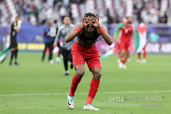 29일(한국시간) 카타르 알라이얀의 칼리파 인터내셔널 스타디움에서 열린 2023 아시아축구연맹(AFC) 카타르 아시안컵 16강전 요르단과 이라크의 경기에서 요르단의 압달라 나시브가 팀 승리에 기쁨을 표하고 있다.