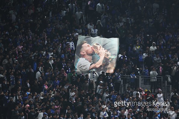 30일(한국시간) 사우디아라비아 리야드의 킹덤 아레나에서 열린 미국 메이저리그사커(MLS) 인터 마이애미와 사우디아라비아 프로리그 알힐랄의 친선 경기에서 관중석의 팬들이 리오넬 메시(인터 마이애미)의 대형 사진을 들어 보이고 있다.