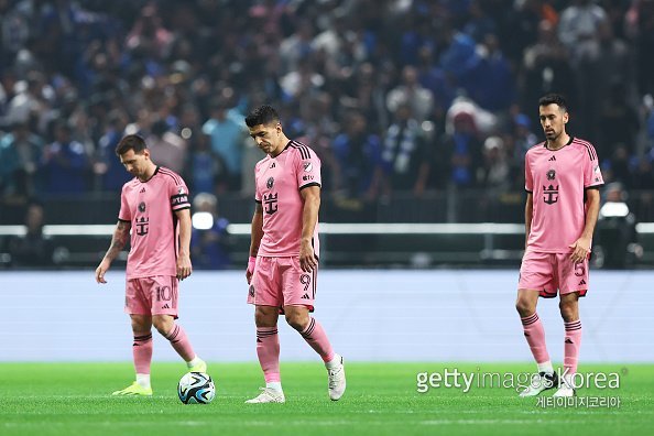 30일(한국시간) 사우디아라비아 리야드의 킹덤 아레나에서 열린 미국 메이저리그사커(MLS) 인터 마이애미와 사우디아라비아 프로리그 알힐랄의 친선 경기에서 인터 마이애미의 리오넬 메시, 루이스 수아레스, 세르히오 부스케츠(왼쪽부터)가 실점 후 아쉬운 표정을 짓고 있다.