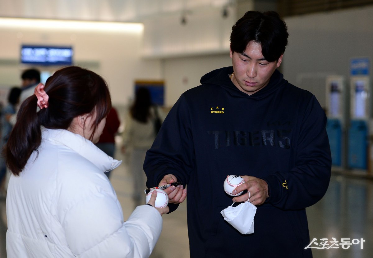 프로야구 KIA 타이거즈가 30일 인천국제공항을 통해 스프링캠프 훈련지인 호주로 출국했다. KIA 나성범이 팬에게 사인을 하고 있다.