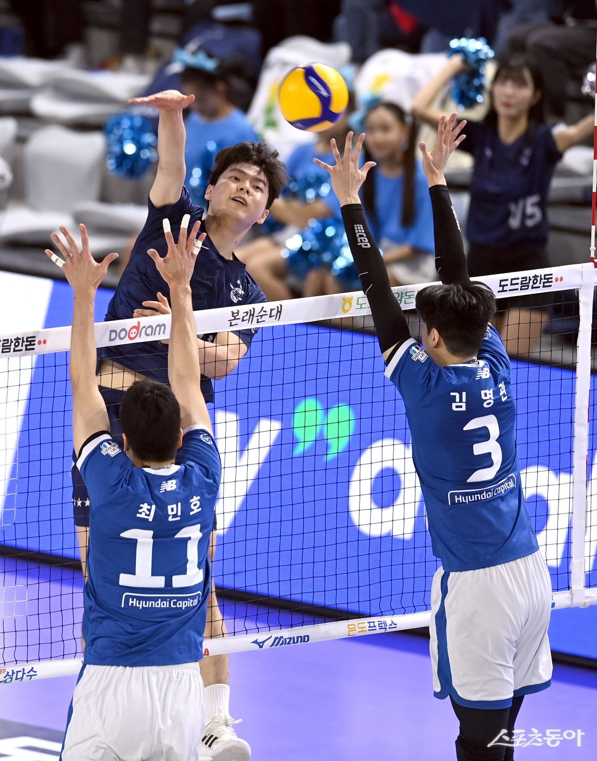 30일 인천 계양체육관에서 열린 ‘도드람 2023~2024 V-리그’ 남자부 대한항공과 현대캐피탈 경기에서 대한항공 정한용이 현대캐피탈의 블로킹 사이로 스파이크를 날리고 있다.