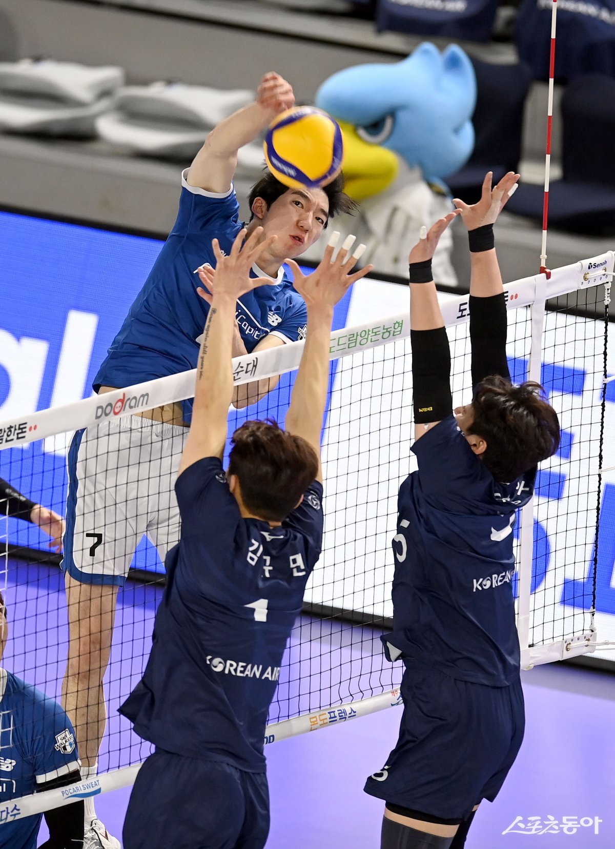 30일 인천 계양체육관에서 열린 ‘도드람 2023~2024 V-리그’ 남자부 대한항공과 현대캐피탈 경기에서 현대캐피탈 허수봉이 대한항공의 블로킹 사이로 스파이크를 날리고 있다.