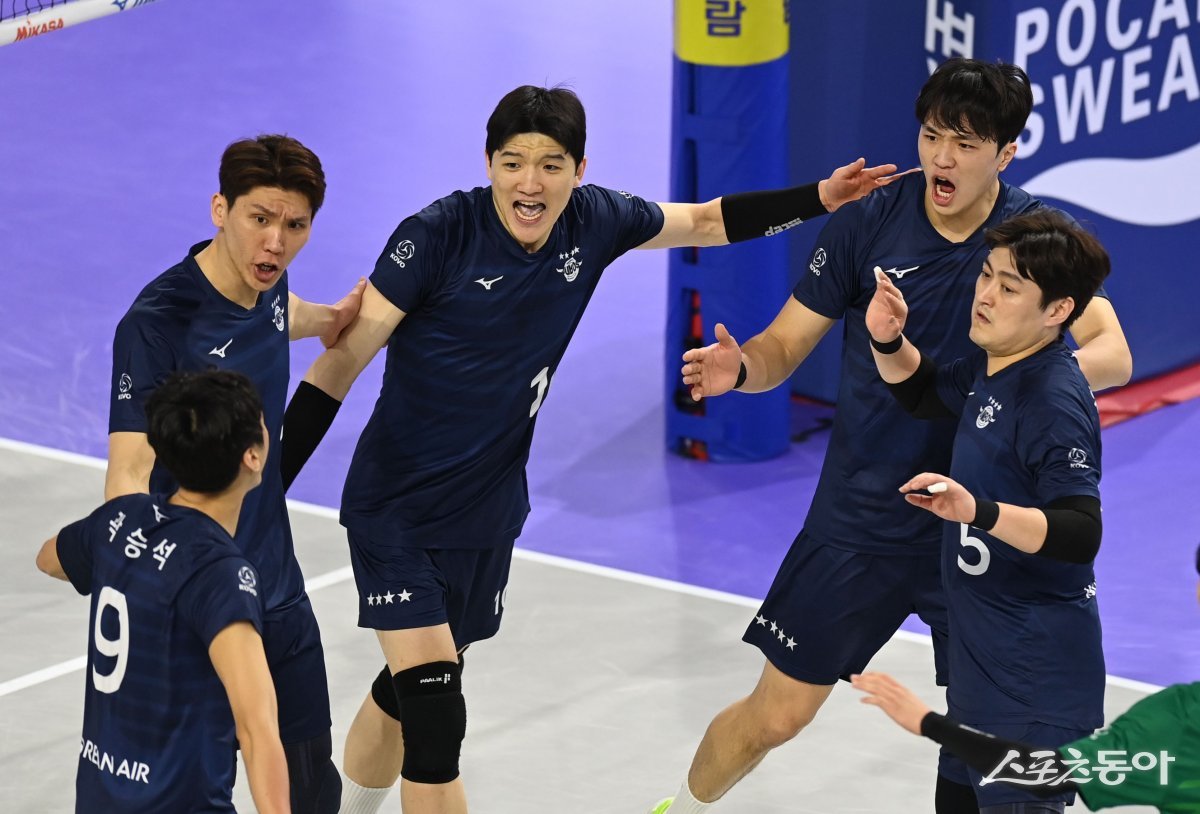 30일 인천 계양체육관에서 열린 ‘도드람 2023~2024 V-리그’ 남자부 대한항공과 현대캐피탈 경기에서 대한항공 정지석이 득점에 성공한 후 임동혁과 환호하고 있다.