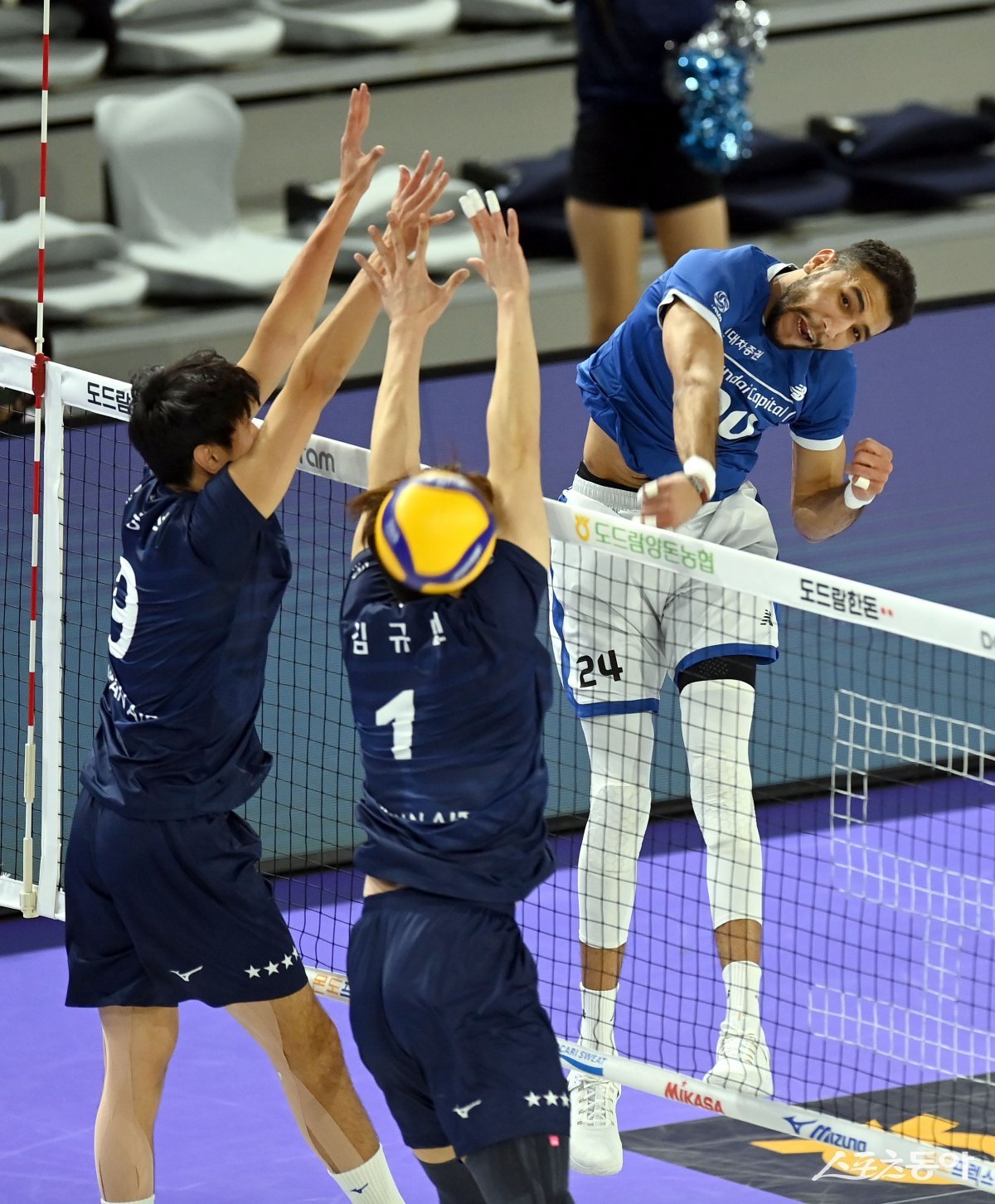 30일 인천 계양체육관에서 열린 ‘도드람 2023~2024 V-리그’ 남자부 대한항공과 현대캐피탈 경기에서 현대캐피탈 아흐메드가 대한항공의 블로킹 사이로 스파이크를 날리고 있다.