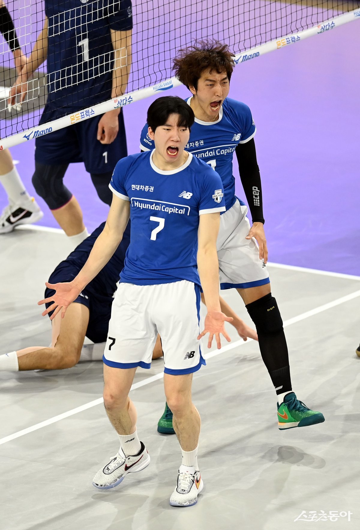 30일 인천 계양체육관에서 열린 ‘도드람 2023~2024 V-리그’ 남자부 대한항공과 현대캐피탈 경기에서 현대캐피탈 허수봉이 블로킹 득점에 성공한 후 기뻐하고 있다.