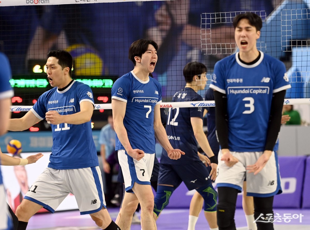 30일 인천 계양체육관에서 열린 ‘도드람 2023~2024 V-리그’ 남자부 대한항공과 현대캐피탈 경기에서 현대캐피탈 허수봉이 득점에 성공한 후 기뻐하고 있다.