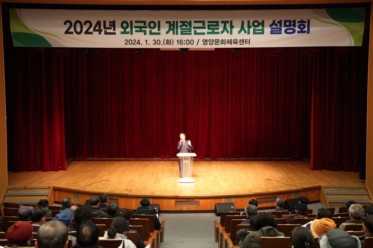 영양군(군수 오도창)은 30일 영양 문화체육센터에서 외국인 계절근로자 신청농가를 대상으로 ‘2024년 외국인 계절근로자 농가 설명회’를 개최했다고 31일 밝혔다.이번 설명회에는 금년 사업 추진계획과 법무부 지침에 따른 사업 진행 절차, 고용주 준수사항 및 안내사항을 설명하는 자리로 외국인계절근로자 사업 신청 농가주 250여 명이 참석했다.
