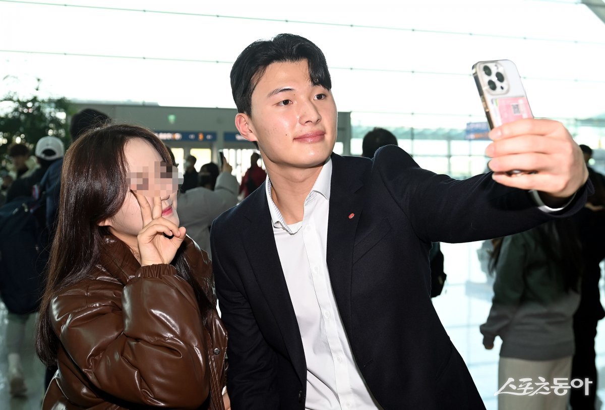 프로야구 롯데 자이언츠가 31일 인천국제공항을 통해 스프링캠프 훈련지인 괌으로 출국했다. 롯데 윤동희가 팬과 기념촬영을 하고 있다.