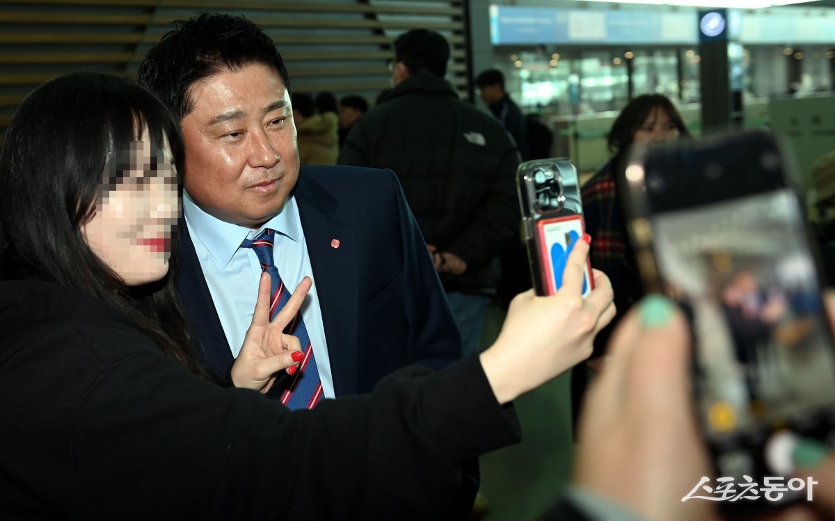 프로야구 롯데 자이언츠가 31일 인천국제공항을 통해 스프링캠프 훈련지인 괌으로 출국했다. 롯데 김태형 감독이 팬과 기념촬영을 하고 있다.