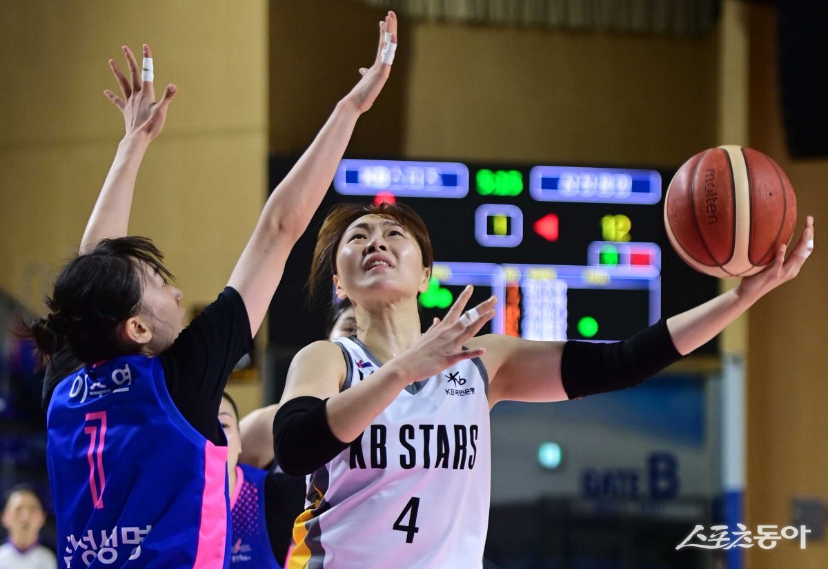31일 경기도 용인실내체육관에서 열린 ‘우리은행 우리WON 2023-2024 여자프로농구’ 용인 삼성생명과 청주 KB의 경기에서 KB 염윤아가 삼성생명 수비 앞에서 슛을 하고 있다.