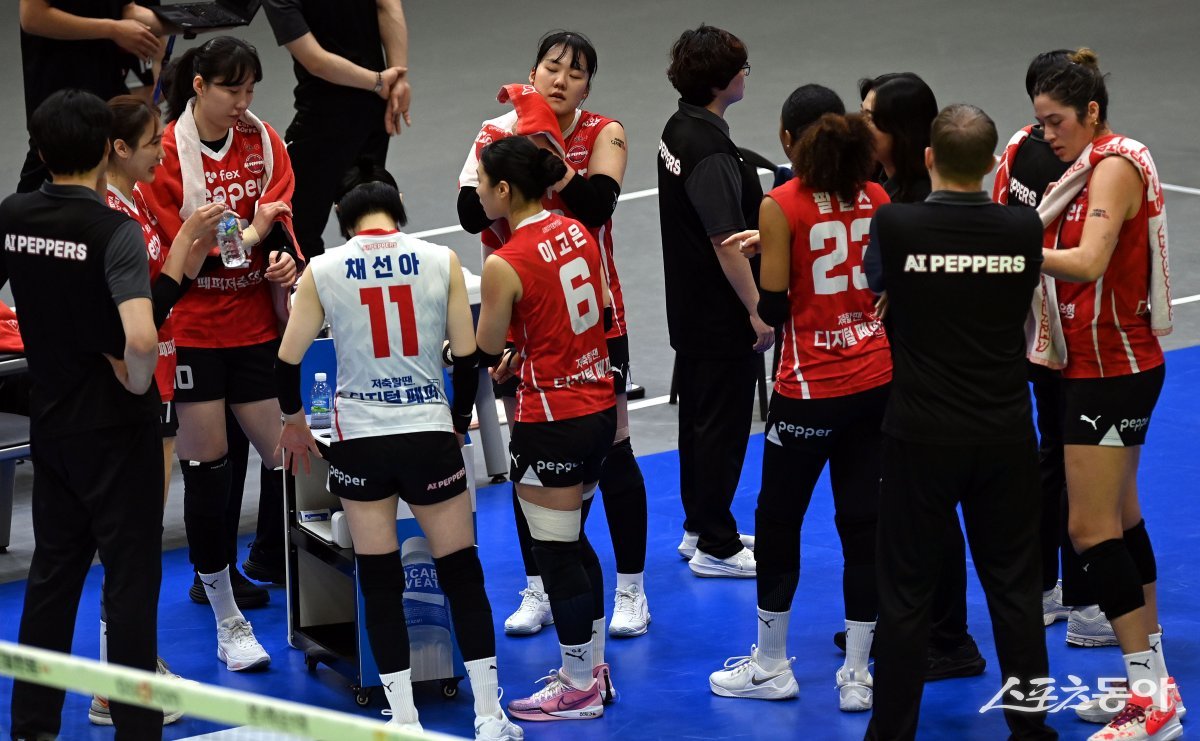 31일 경기도 수원체육관에서 ‘2023-2024 도드람 V리그’ 수원 현대건설과 광주 페퍼저축은행의 여자부 경기가 열렸다. 1세트를 패한 페퍼저축은행 선수들이 아쉬워하고 있다.