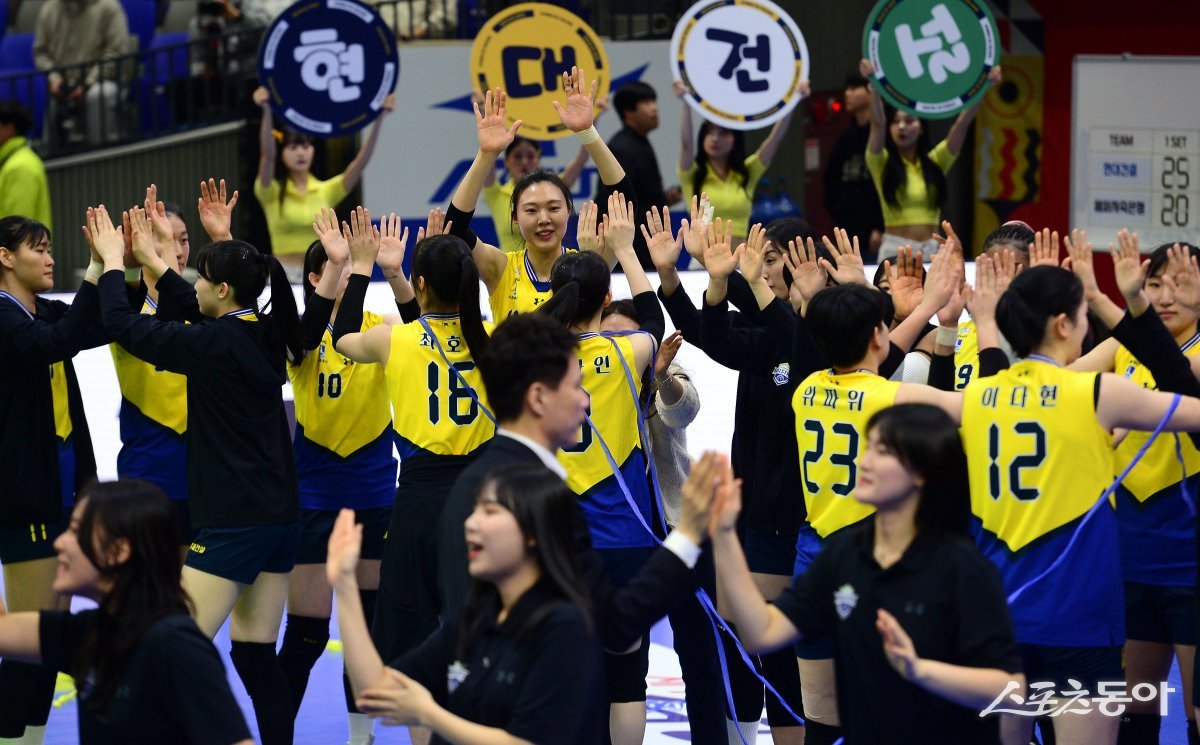 31일 경기도 수원체육관에서 ‘2023-2024 도드람 V리그’ 수원 현대건설과 광주 페퍼저축은행의 여자부 경기가 열렸다. 현대건설이 페퍼저축은행을 상대로 세트스코어 3-1 승리한 후 선수들이 코트에서 기쁨을 나누고 있다.